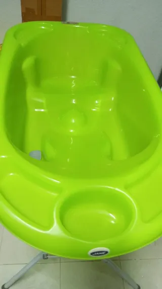 Bañera para bebé de la marca Jane, en color verde brillante. Incluye un soporte plegable para mayor comodidad. - Bañera de plástico. - Soporte metálico plegable.
