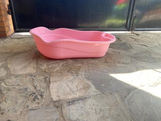 Bañera de plástico rosa para bebés. Cuenta con un diseño ergonómico para mayor comodidad. - Asiento integrado para recién nacidos. - Bordes redondeados para seguridad. - Dos asas laterales para facilitar el transporte.