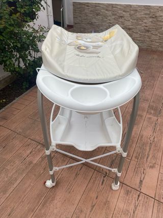 Vendo bañera cambiador para bebé de la marca CAM. Está en buen estado, con algunos signos normales de uso. - Incluye bañera y cambiador. - Estructura de metal con ruedas. - Bandeja inferior para almacenamiento. - Diseño con estampado de ositos.