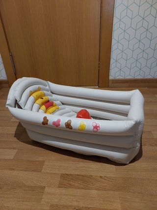 bañera hinchable. nosotros la hemos usado como piscina para un bebe de 4 meses. Apenas ha sido usada. Se puede tumbar, sentar o quitar el interior. (adjunto foto de las tres maneras) desinflada no ocupada nada y se infla muy facilmente incluso con la boca.