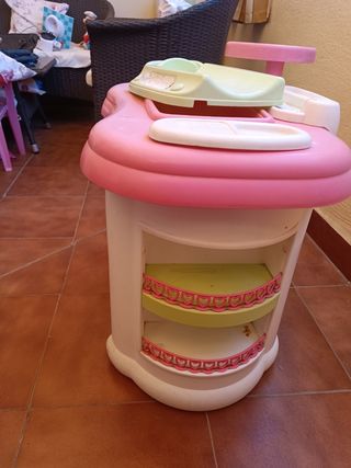 Preciosa bañera cambiador para bebé, en tonos rosas y verdes. Está en buen estado, aunque tiene algunas señales de uso. - Incluye cambiador y bañera. - Dos estantes para guardar cosas. - Diseño adorable con detalles de corazones.