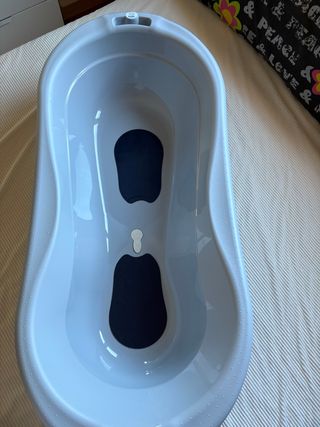 Bañera para bebés de la marca alemana Rotho. Diseñada para la comodidad y seguridad. - Forma ergonómica. - Material plástico resistente. - Base antideslizante. A mi hijo le encantó lo que pasa que ya no la utiliza ya que le baño en la bañera. La compré porque al principio no podía utilizarla ya que estaba en obras. Mi hijo ha sido feliz en esa bañera durante dos meses