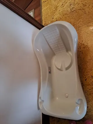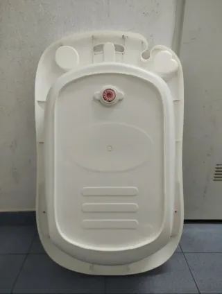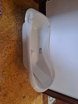 Bañera para bebé, en perfecto estado. Es de color blanco y tiene un diseño sencillo y práctico. - Ideal para bañar a bebés de forma cómoda y segura. - Fabricada en plástico resistente y fácil de limpiar. - Diseño ligero y compacto para facilitar su almacenamiento.