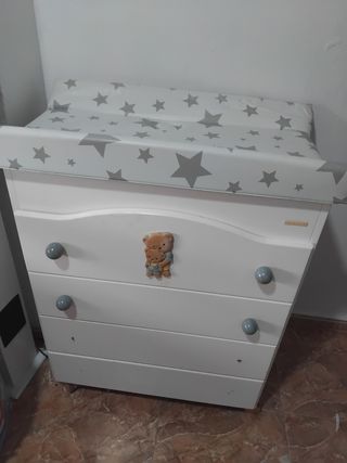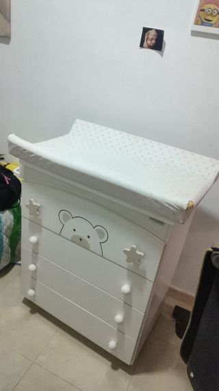 Cambiador para bebé con diseño de osito. - Estructura blanca. - Tres cajones. - Adorno de estrellas. no se envia ,recogida en persona algun desgaste en el plastico ,pero eso se puede cambiar al gusto