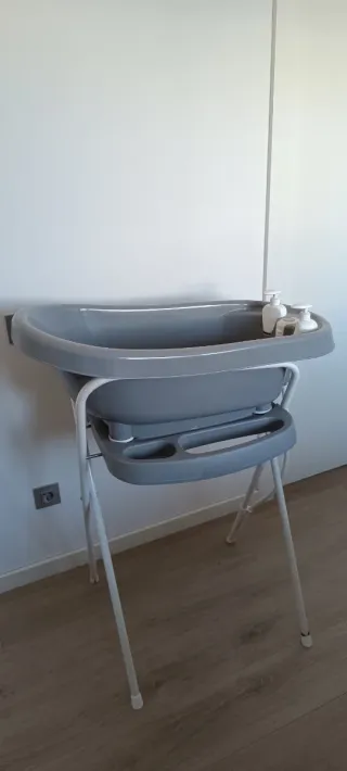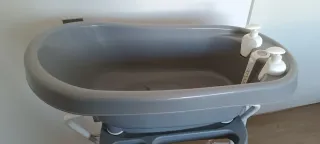 Bañera para bebé Bébéjou Thermobath en color gris. Incluye soporte y adaptador recién nacido. - Bañera de plástico resistente. - Soporte metálico plegable. - Bandeja inferior para accesorios. Toallero. - botes para champú y gel Precio original: 130 euros. - algunos desperfectos por uso: base de una pata oxidada, rozaduras en el adaptador de recién nacido.