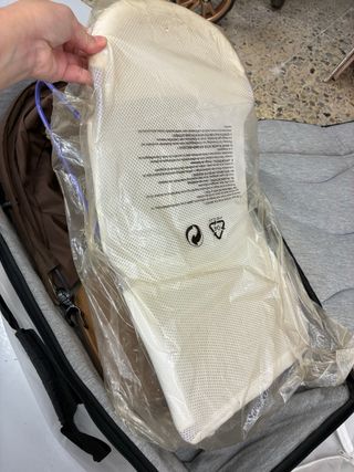 Soporte para bañera balancín de bebé. - Material de malla transpirable. - Color blanco. está nuevos estrenar , ha estado guardado en un trastero y el plástico protector está amarillo pero lo he abierto un poco para que se vea que lo de dentro está blanco nuevo