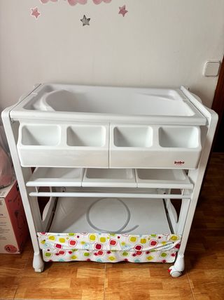 Práctico cambiador con bañera integrada para el cuidado del bebé. Su diseño permite tener todo a mano. - Estructura metálica resistente. - Bandeja inferior para almacenamiento. - Compartimentos laterales para accesorios. - Altura: 107cm. - Ancho: 82cm. - Profundidad: 65.5cm.
