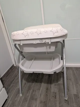 Preciosa bañera cambiador para bebé, de la marca Flip. Está en muy buen estado y es perfecta para cuidar a tu pequeño. - Incluye cambiador acolchado con estampado de estrellas. - Dispone de una bandeja inferior con espacio para guardar productos de higiene. - Estructura ligera y fácil de montar y desmontar. - Ruedas para facilitar el movimiento.