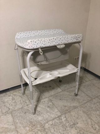 Bañera para bebé de la marca Chicco, con cambiador acolchado. en general bien estado solo la parte de arriba que se ha manchado un poco. - Cambiador acolchado con estampado de rayas. - Bandeja organizadora. - Estructura plegable con ruedas.