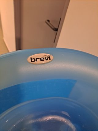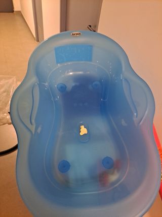 Bañera para bebé de la marca Brevi, en color azul. Está en buen estado. - Ideal para bañar a tu bebé con comodidad y seguridad. - Fabricada en plástico resistente y ligero. - Diseño ergonómico con asas integradas. Puedes ponerla a una altura en sus patas con los ganchos que lleva o ponerla a nivel de suelo con las patitas en forma de huella