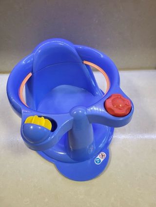Sillita para el baño del bebé, con un diseño seguro y cómodo. -Para sentar al bebé cuando le quitas de la bañerita de bebe y le pasas a bañera o ducha del baño, evitando resbalones y riesgos de golpes - Estructura principal en color blanco. - Asiento y arco superior en color azul. - Dos botones decorativos en forma de concha, uno rojo y otro verde que valen para que el bebé juegue y toque mientras le bañas.