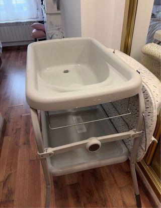 Práctico cambiador con bañera incorporada para el cuidado del bebé. Su diseño permite un fácil acceso y comodidad. - Estructura de plástico resistente. - Incluye cubeta para el baño. - Ruedas para facilitar el desplazamiento. Negociables. Se recoje en brunete.