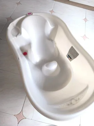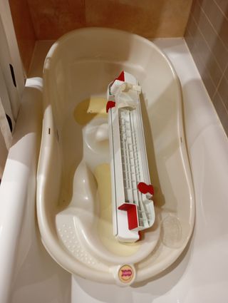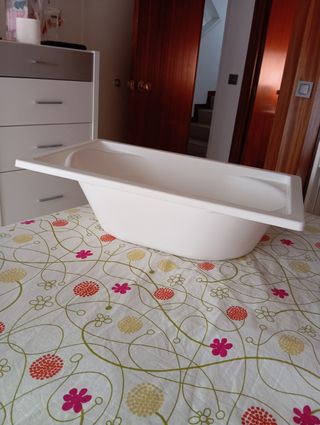 Bañera para bebé con soporte para colocarla en la bañera. Está en buen estado (con marcas de uso) y es perfecta para bañar a los más pequeños de forma cómoda y segura. - Incluye soporte para una fácil instalación. - Material plástico resistente y ligero. - Diseño ergonómico para mayor comodidad del bebé. - Alfombrilla antideslizante. Dimensiones máximas de la bañera: 54 x 28 x 94cm Medidas de extensión mínima de las barras: 53cm Medidas de extensión máxima de las barras: 75cm Dimensiones máximas del caballete: 75 x 86 x 71cm