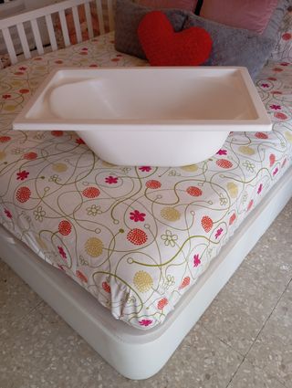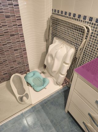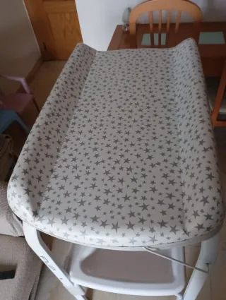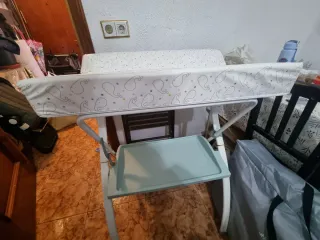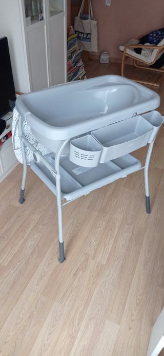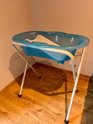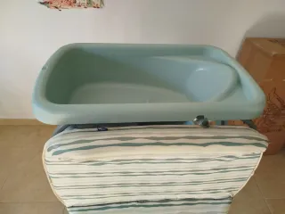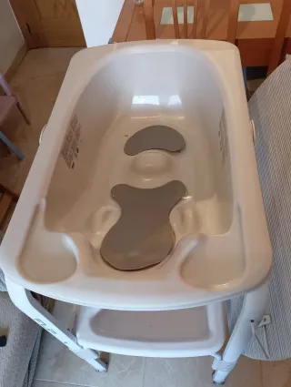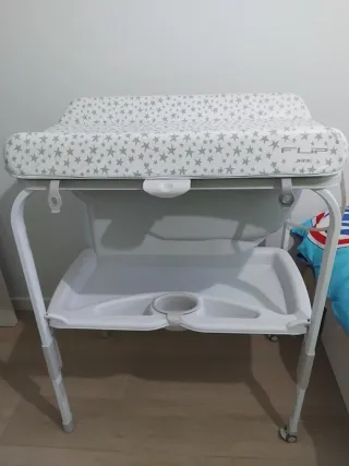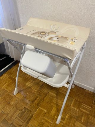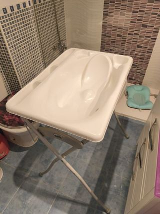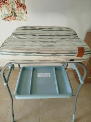 Bañera de bebé con estructura en perfecto estado, es el cambiador el que está rajado como se ve en la foto. Tiene bañera aunque no salga en la foto, y está en muy buen estado. Es perfecta para poner encima del bidé en baños pequeños Es plegable y fácil de guardar. Ideal para cambiar pañales y bañar a tu pequeño con comodidad y seguridad. - Estructura ligera y resistente. - Bandeja inferior para guardar artículos de higiene. - Color azul y blanco