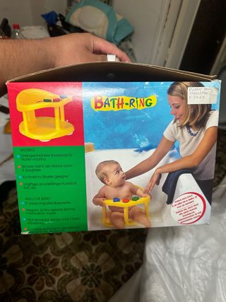 Asiento de ducha para bebé Bath-Ring, ideal para que los más pequeños disfruten del baño de forma segura. - Fabricado en plástico reciclable y libre de PVC. - Se fija a la bañera mediante 4 ventosas. - Adecuado para bebés en edad de sentarse.