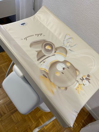 Cambiador con bañera plegable para bebé, en color beige claro. Está en buen estado. - Estructura plegable para facilitar el almacenamiento. - Incluye bañera de plástico. - Bandeja inferior para guardar artículos de aseo. Cambiador con bañera plegable, se entrega sin la colchoneta ya que se encontraba deteriorada. Es ponerle una colchoneta nueva y queda como nuevo, de ahí el precio. Medidas 80X 48 X 90 cm.