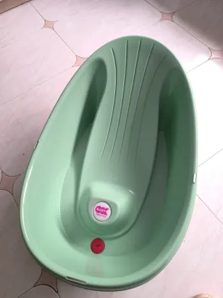 Bañera de plástico para bebés, de color verde brillante. Diseñada para la comodidad y seguridad durante el baño. - Asiento integrado para mayor soporte. - Asas laterales para facilitar el transporte. - Tapón de drenaje para vaciarla fácilmente.