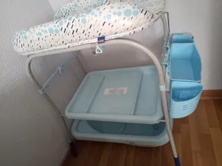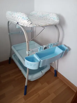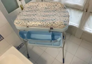 Cambiador con bañera (la bañera no sale en las fotos pero también la entregaría si se quiere) en buen estado , tiene dos pequeñas marcas en el acolchado pero está en buenas condiciones, poco uso. Desde 0 hasta 12 meses. Precio nueva 150 euros