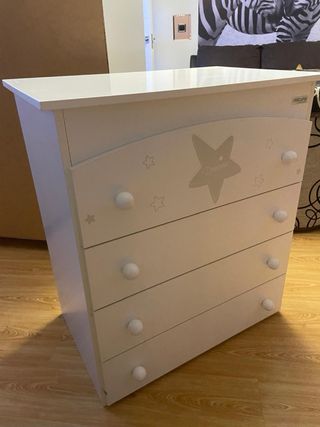 Cómoda cambiador y bañera infantil de color blanco, perfecta para habitaciones de niños o bebés. Presenta un diseño dulce con estrellas. - Cuatro cajones amplios. - Tiradores redondos. - Acabado liso y fácil de limpiar. Se puede utilizar como cambiador