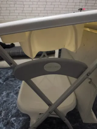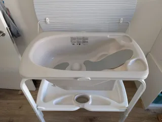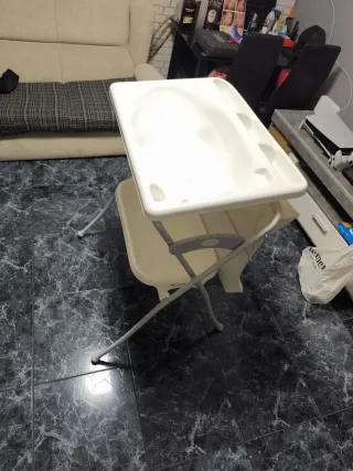 Bañera y cambiador para bebés, ideal para el cuidado diario. - Incluye cambiador acolchado. - Funda de cambiador. - Bandeja inferior para accesorios. - Estructura plegable y estable. Buen estado, mancha en la goma que no se quita de estar guardado.