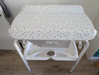 Práctico cambiador con bañera integrada para bebés. Ideal para el cuidado diario del pequeño. - Estructura plegable y fácil de guardar. - Bandeja inferior para accesorios. - Superficie acolchada para mayor comodidad. Está un poco dañada por una esquina, pero se puede colocar una funda y no entorpece su función.