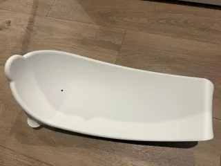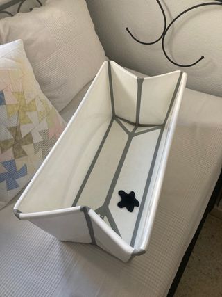 Bañera plegable para bebé, en buen estado. Es blanca con detalles grises. - Plegable para facilitar el almacenamiento. - Ideal para bañar a tu bebé con comodidad. no es de Stokke, y tiene la pestaña rota, aunque se mantiene cerrada perfectamente