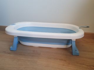 Bañera para bebé con estructura plegable y patas. Está en buen estado, lista para usar. - Incluye bañera y soporte. - Material plástico resistente. - Diseño plegable para facilitar el almacenamiento.