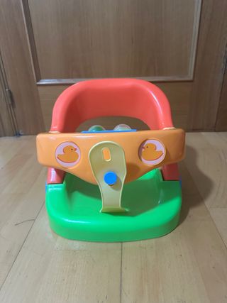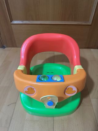 Sillita adaptadora para el baño del bebé, con un diseño divertido y colorido. - Detalles de patitos amarillos. - bolitas que se mueven para entretener al peque. - lleva 3 ventosas en la parte de abajo para asegurar el agarre a la ducha/bañera. - El espaldar se puede reclinar un poco y tiene 2 niveles de sujeción.
