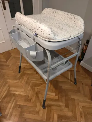 Preciosa bañera cambiador para bebé, en perfecto estado. - Incluye cambiador acolchado. - Dispone de dos cestas para guardar artículos de higiene. - Estructura ligera y fácil de montar. - Bandeja inferior para mayor espacio de almacenaje. - Ruedas para facilitar el movimiento