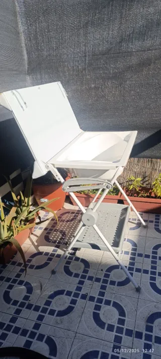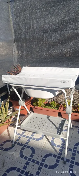 Bañera cambiador para bebé, plegable y fácil de guardar. Ideal para facilitar el baño y el cambio de pañales. - Incluye bañera y cambiador. - Estructura plegable de metal. - Bandeja inferior para accesorios. - Se encuentra en buen estado.,su precio nueva 95 euros
