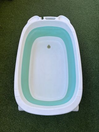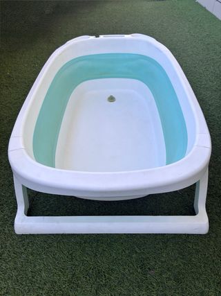 Bañera ideal para bebes, plegable y muy cómoda de transportar, no pesa y no ocupa nada, muy bonita y tiene para sujetar el jabón y el grifo, con tapón, para fácil vaciado. Disponible sillita adaptable para poner al bebe dentro de la bañera.