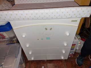 Bonito cambiador de bebé con cuatro cajones de colores pastel. Está en buen estado, aunque presenta algunas marcas de uso. - Estructura blanca. - Cuatro cajones de colores pastel (azul, amarillo, rosa y verde). - Conserva todos los accesorios: bañera, tubo de vaciado, porta utensilios, cambiador. - Ruedas para facilitar el movimiento y freno.