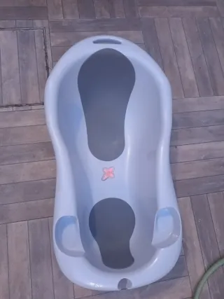 Bañera para bebé de la marca Olmitos, en buen estado. Incluye soporte para facilitar el baño. - Bañera blanca con detalles grises. - Incluye soporte plegable. - Reposa cabezas integrado.
