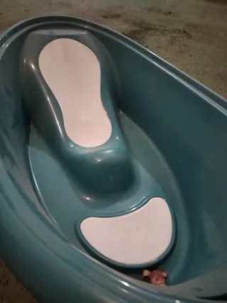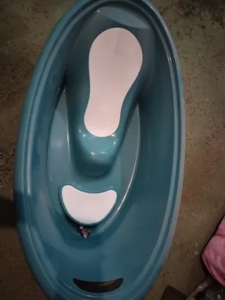 Bañera ergonómica para bebés, diseñada para la comodidad y seguridad durante el baño. - Color azul. - Diseño con soporte antideslizante. Lo único el tapón que como es de goma está como pegado.