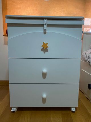 Cómoda bebe blanca de 3 cajones con 2 juegos de pomos originales (blancos y estrella), con cambiador y bañera a estrenar.Ruedas con freno incluidas. Muy buen estado.Marca PRENATAL. Solo venta en persona.
