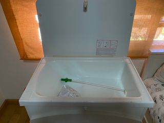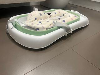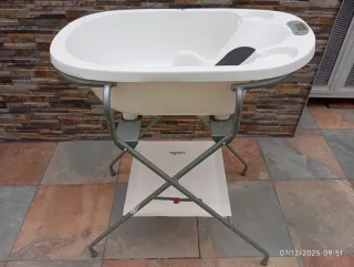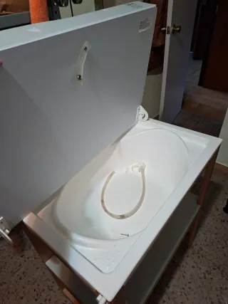 Bañera bebe rigida con patas plegables, con taoon y tubo de desague, con tenperatura del agua y cacito para echar agua. Esta muy nueva , en perfectas condiciones.
