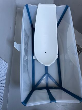 Bañera Flexi Bath plegable de color azul con soporte cuña incluída para el bebé.Buen estado. Marca Stokke, precio original en web de la marca de 83 euros. (59 la bañera y 24 el soporte)