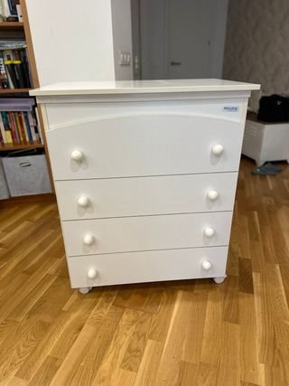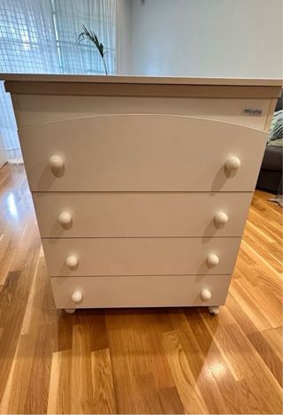 Mueble cambiador-bañera de la marca Micuna. Un práctico mueble para el cuidado del bebé. Coste real 350€ - Diseño en color blanco. - Cuatro cajones amplios. - Ruedas para facilitar su movilidad. - Cambiador elevable con bañera interior primer cajón reforzado. tiene algún roce mínimo pero el mueble está en perfecto estado