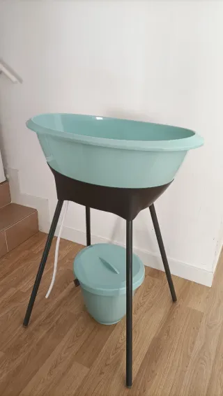 bañera para bebe con patas plegables. la bañera incluye desagüe (tubo transparente) para no tener wje coger la bañera a pulso para vaciarla. Altura de las patas 83cm. medidas de la bañera: 76x54cm regalo respaldo para bebe