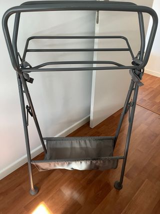Práctico soporte plegable para bañera de bebé, modelo Twist & Shake. Su diseño permite guardarlo fácilmente. - Estructura metálica. - Incluye una cesta de tela inferior. - Correas de sujeción. El precio está ya rebajado debido a la mancha en la tela inferior de la estructura.