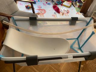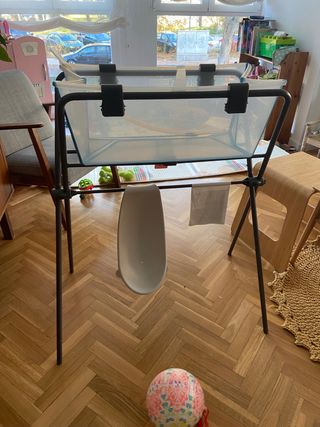 Bañera plegable de la marca Stokke, diseñada para facilitar el baño del bebé. Incluye el soporte para elevarla. - Material: Plástico transparente y estructura metálica. - Color: Transparente con detalles en azul marino y gris.