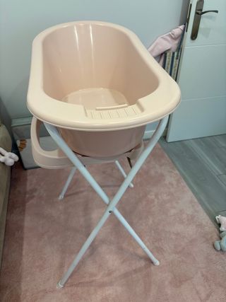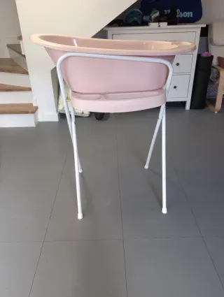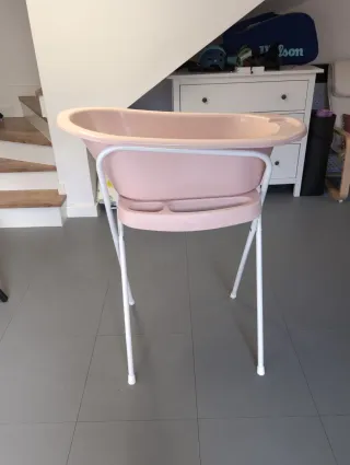 Bañera para bebé en color rosa, ideal para el baño diario. Incluye un soporte plegable blanco. - Bañera de plástico resistente. - Soporte metálico con patas antideslizantes. - Diseño ergonómico para mayor comodidad.