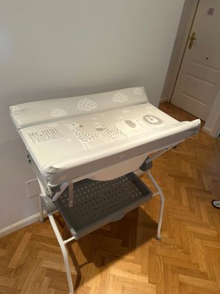 Cambiador con bañera de la marca Chicco, en color gris. Está en buen estado y es muy práctico para el baño y el cambio de pañales del bebé. Esta practicamente nuevo. - Incluye cambiador y bañera integrados. - Dispone de varios compartimentos para guardar artículos de higiene. - Estructura ligera y fácil de montar.