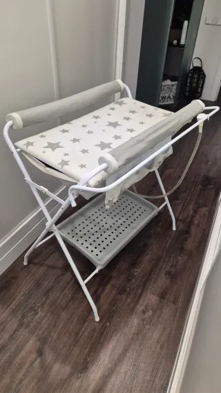 Práctica bañera cambiador para bebés, con un diseño moderno y funcional. - Estructura plegable de metal blanco. - Colchoneta cambiador con estampado de estrellas grises. - Bandeja inferior de plástico gris con orificios para drenaje. - Bañera blanda para mayor comodidad y más facilidad de vaciado