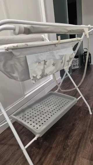 Cambiador de bebé plegable en buen estado. Perfecto para ahorrar espacio. - Incluye bañera y cambiador. - Estructura plegable de metal blanco. - Bandeja inferior para guardar cosas. - Diseño con estampado de triángulos. - Plegado compacto Rasgado en un lateral