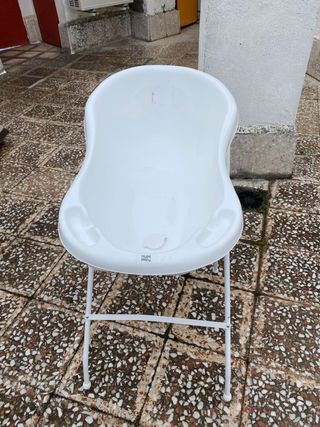 Bañera blanca para bebé con un práctico soporte. - Diseño ergonómico para mayor comodidad. - Soporte plegable para fácil almacenamiento. - Marca: Hulaj Baby. La pegatina decorativa que traía está desgastada. De resto, todo está perfecto.