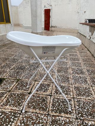 Bañera para bebé marca Brevi. Con estructura de patas plegable y soporte para toalla. Con tapón para desagüe. También tiene 4 soportes de patas adicionales para apoyo de bañera sobre suelo o mesa. Medidas bañera: 53 x 76 cm. Altura de patas: 82 cm. En muy buen estado.