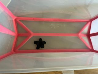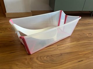 Bañera para bebé de la marca Stokke, diseñada para la comodidad y seguridad durante el baño. Incluye un reductor para recién nacidos. - Material: Plástico resistente. - Color: Transparente con detalles en rosa y blanco. - Diseño ergonómico.