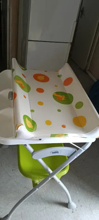 Cambiador de bebé con bañera integrada, ideal para el cuidado diario. - Estructura metálica resistente. - Bandeja inferior para accesorios. - Colchoneta acolchada con estampado.