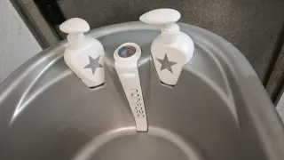 Bañera para bebés con diseño moderno y práctico. - Incluye termómetro para controlar la temperatura del agua. - Dos dispensadores para jabón o champú. - Decorada con estrellas grises. - Marca: Bebejou.